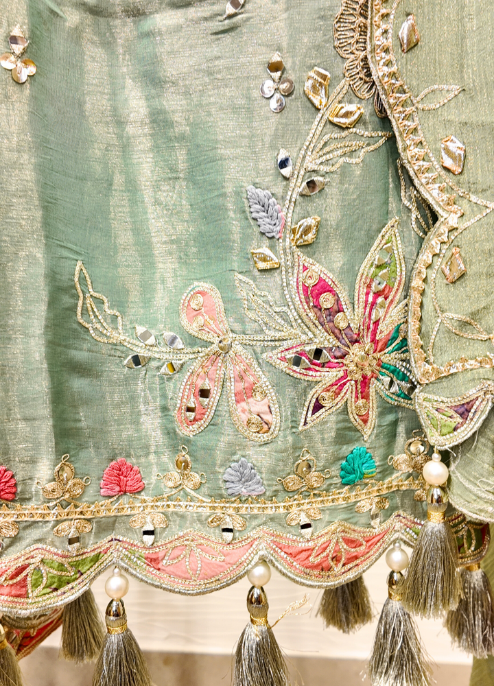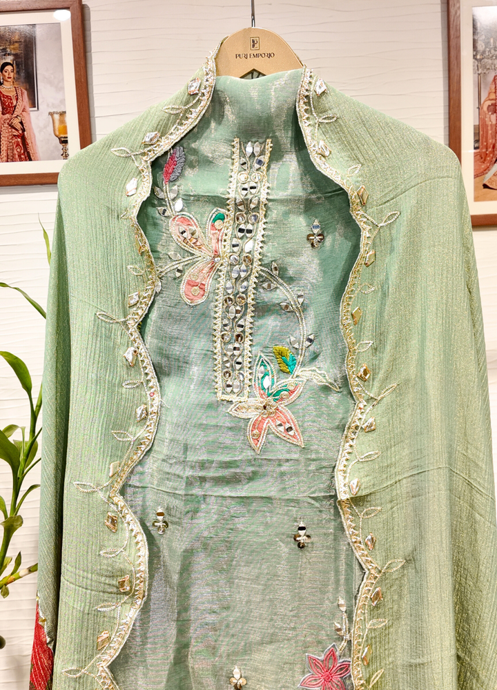 Pista Green Tissue Georgette Suit with Resham & Gota Work