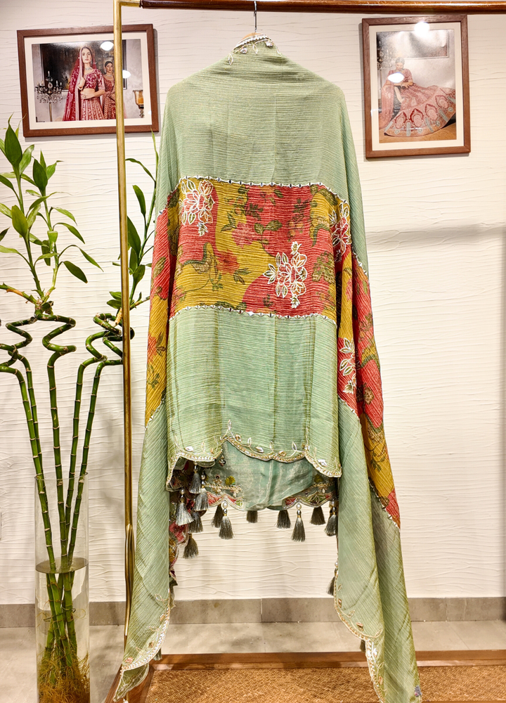Grace every celebration with our Pista Green Tissue Georgette Suit Set, adorned with delicate resham embroidery and shimmering gota work. This three-piece ethnic ensemble beautifully blends traditional artistry with a modern pastel palette, making it a timeless addition to your festive wardrobe. Product Details: