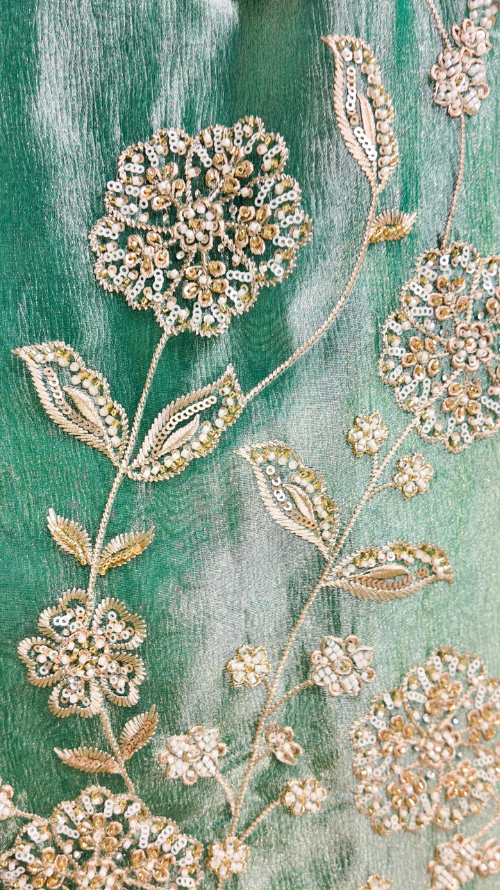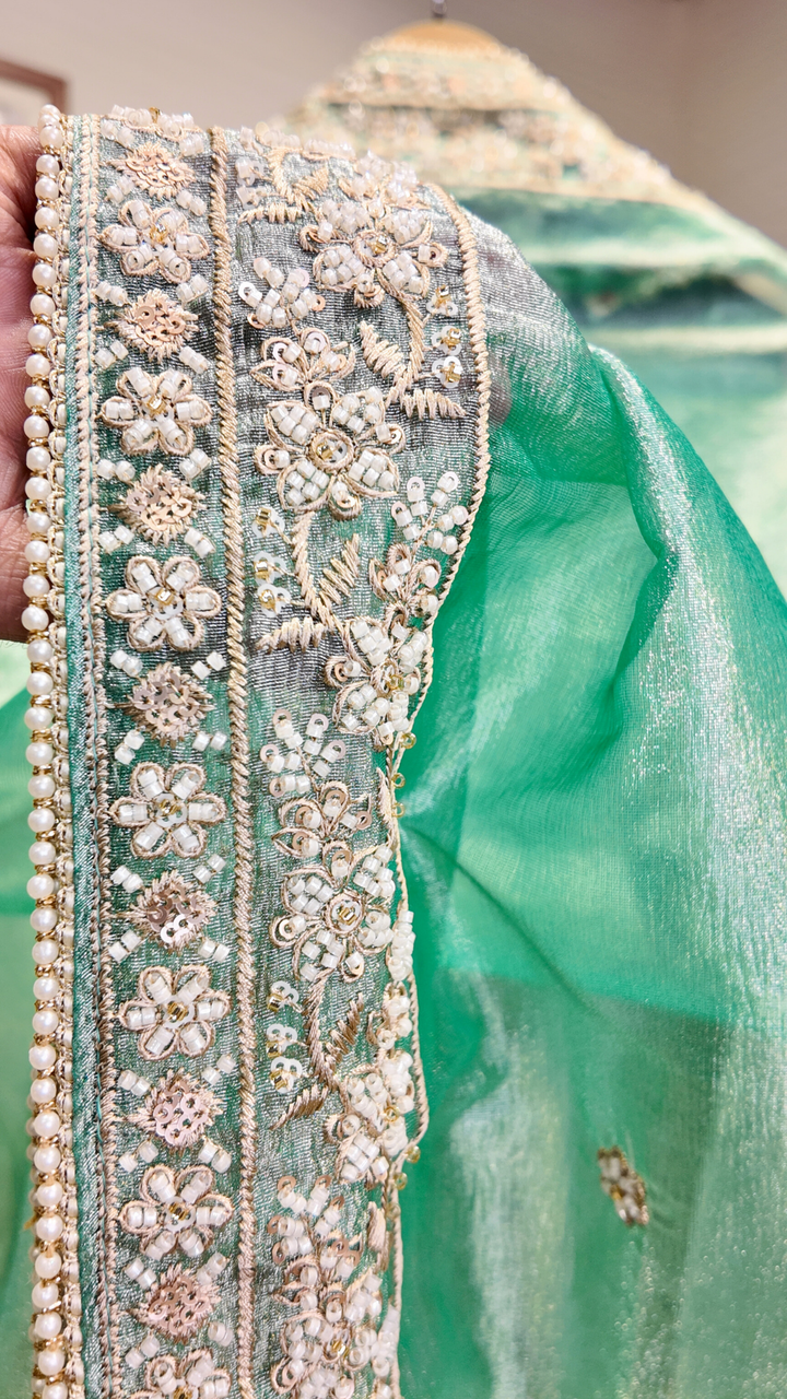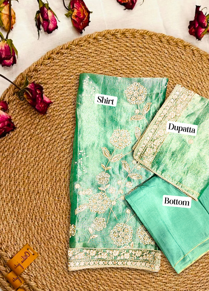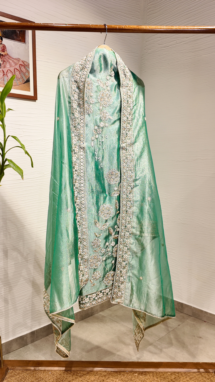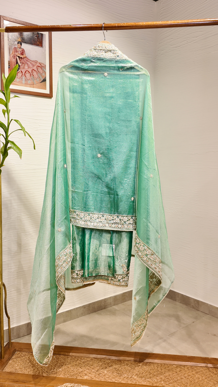 Make every celebration unforgettable with this stunning turquoise tissue suit set, adorned with exquisite handwork that adds a touch of artistry and elegance to your festive wardrobe.