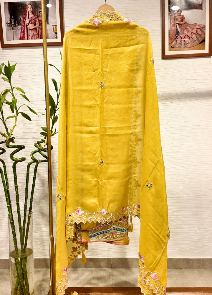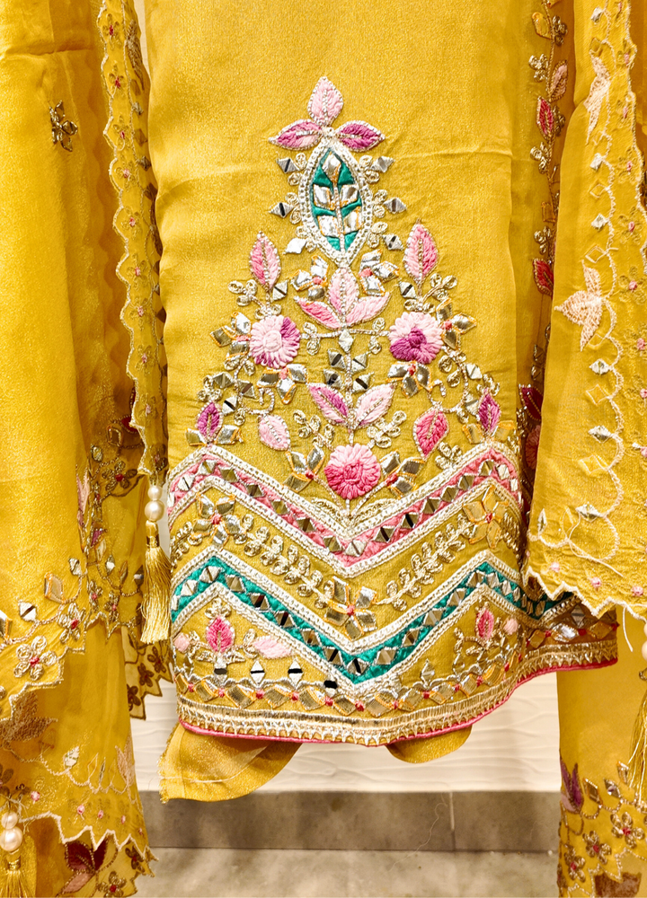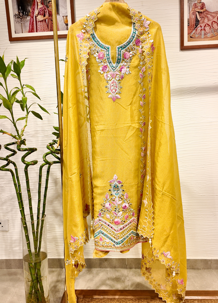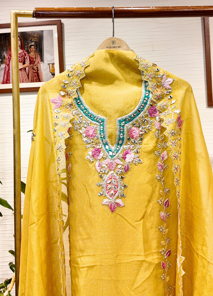 Yellow Tissue Georgette Suit with Resham & Gota Work